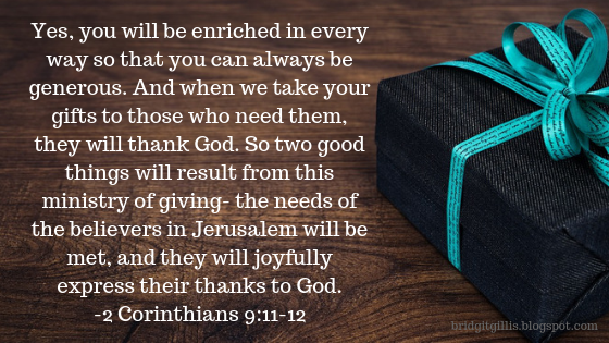 You must each decide in your own heart how much to give. And don’t give reluctantly or in response to pressure. “For God loves a person who gives cheerfully.” And God will generously provide all you need. Then you will always have everything you need and plenty left over to share with others. -2 Corinthians 9:7-8